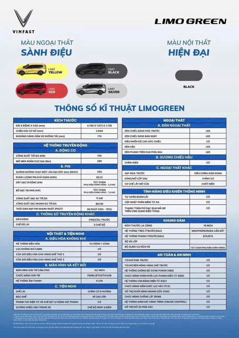 Báo giá và chương trình nhận cọc Theo thông tin chính thức từ VinFast, giá niêm yết của VinFast Limo Green là 749 triệu đồng. Từ ngày 25/3/2025, khách hàng có thể đặt cọc Vinfast Limo Green trên toàn quốc tại các showroom và đại lý chính hãng. Hotline tư vấn và nhận cọc : 0793655243